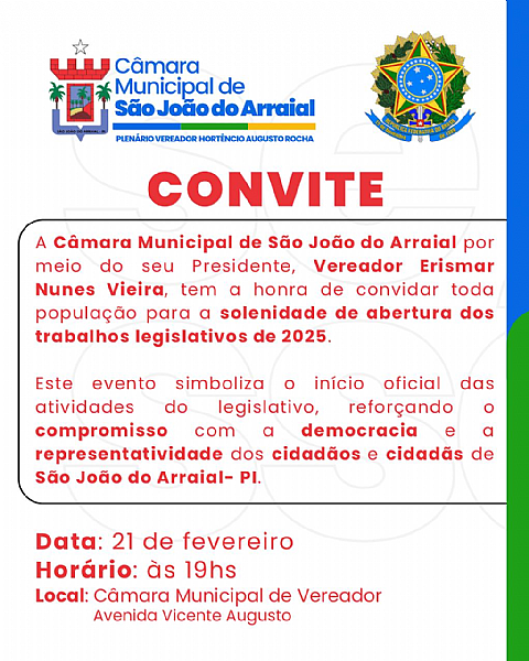 Leia +E aí, pessoal!Quer saber o que está rolando na Câmara Municipal de São João do Arraial? Siga a gente e fique por dentro das novidades, proje...